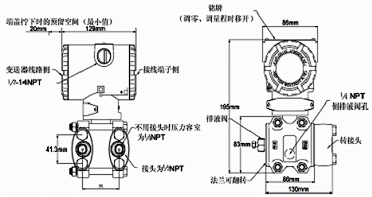 例:TDSB3051差壓變送器,量程0-300kpa,兩線制4~20 mA DC信號(hào)輸出,法蘭接頭、排氣/排液閥、隔離膜片均為316不銹鋼,智能表顯示器,管裝平支架,泄放閥在壓力室側(cè)面的上部,橢圓接頭內(nèi)螺紋NPT 1/2