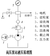 電動機(jī)通過聯(lián)軸器直接帶動齒輪泵泵油,壓力油經(jīng)過溢流閥調(diào)節(jié)通往單向閥到達(dá)四通集成塊,分別供給壓力表、調(diào)節(jié)截止閥和用油對象供油;